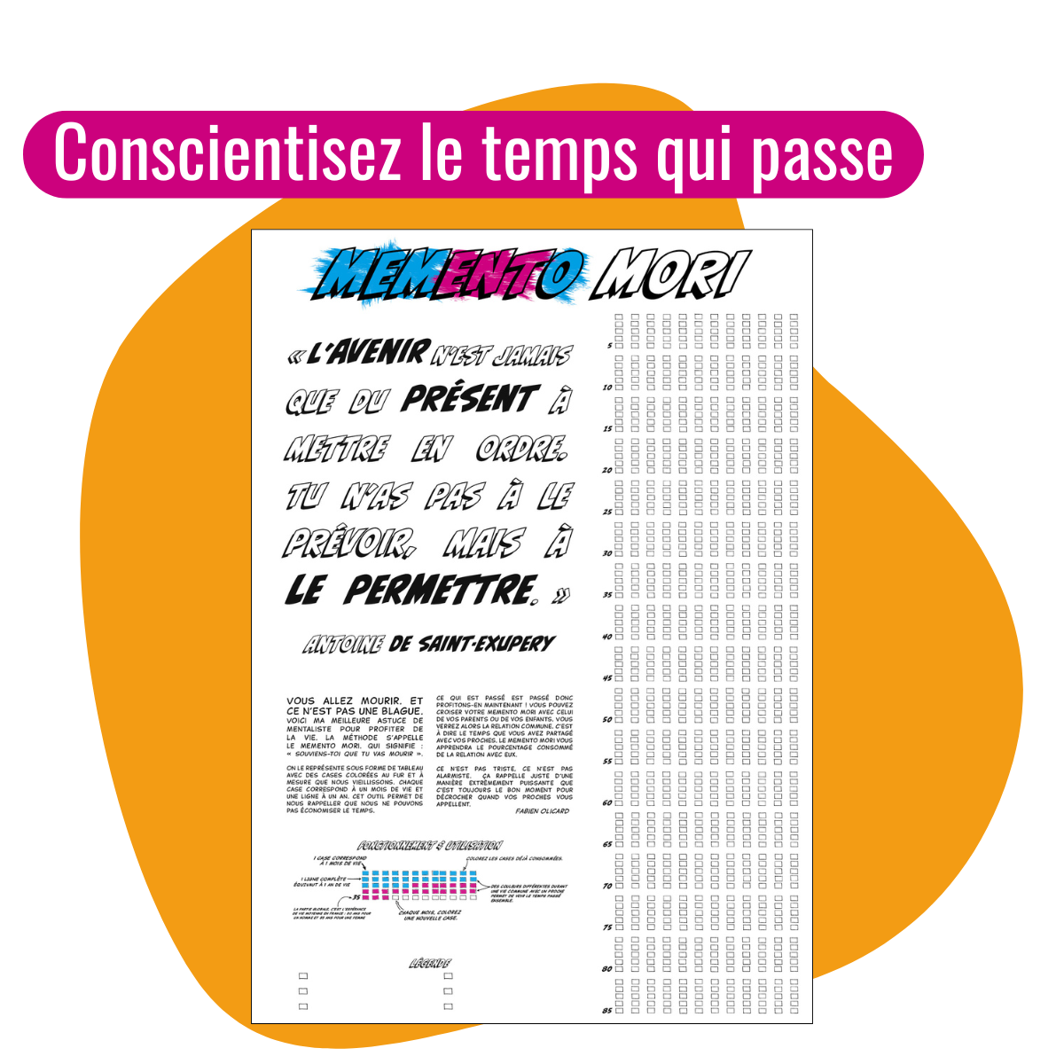L'affiche Memento Mori vous offre une vision saisissante de votre existence, mois après mois, année après année. Chaque case représente un mois de votre vie, à colorier au fil du temps pour visualiser votre parcours et les liens que vous avez tissés avec vos proches.